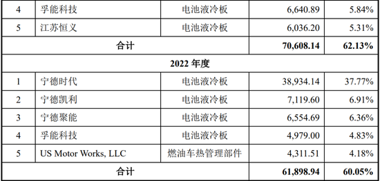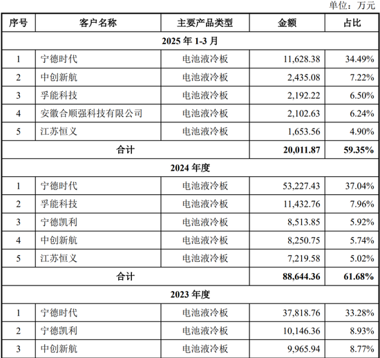 报告期内,公司前五大客户的销售收入占营业收入的比例分别为60.05%、62.13%、61.68%、59.35%,主要客户相对集中。公司下游行业具有集中度较高的特点,公司在动力电池领域的主要客户为宁德时代、中创新航、孚能科技等,在储能系统领域的主要客户为宁德时代、阳光电源、海辰储能等,以及上述客户指定的箱体厂或配件商,上述客户在动力电池、储能系统等领域占据了较高的市场份额。