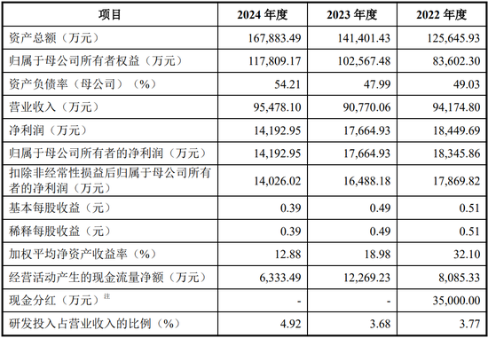 报告期内,公司营业收入分别为94,174.80万元、90,770.06万元和95,478.10万元,扣除非经常性损益后归属于母公司所有者的净利润分别为17,869.82万元、16,488.18万元和14,026.02万元。
