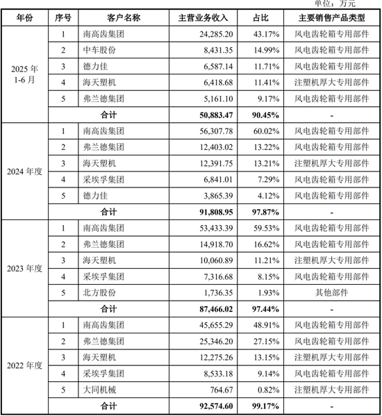 报告期内,公司来自前五大客户的收入占主营业务收入的比例分别为99.17%、97.44%和97.87%,来自全球风电齿轮箱制造龙头南高齿集团的收入占主营业务收入比例分别为48.91%、59.53%和60.02%。