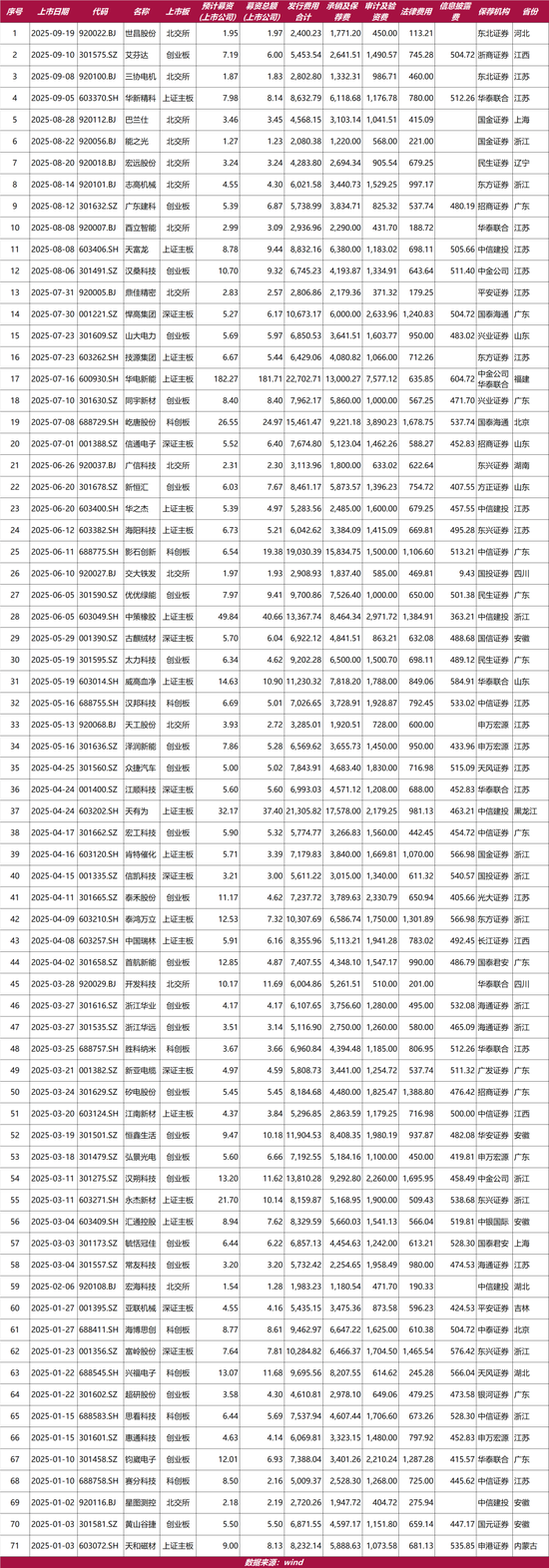 截止9月19日,2025年A股共有71家IPO企业顺利发行上市,从板块来看,分别是创业板25家、上证主板16家、北交所14家、科创板8家和深圳主板8家。