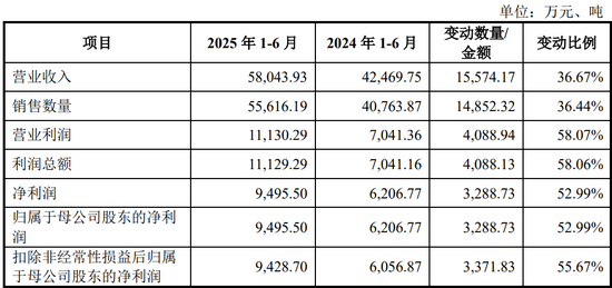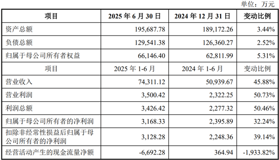 2025年1-6月,公司营业收入为74,311.12万元,较上年同期增长45.88%,扣除非经常性损益后归属于母公司所有者净利润为3,128.28万元,较上年同期增长39.14%,主要系下游需求增长,发行人自身产销规模提升所致。