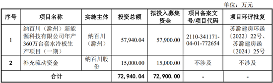 本次IPO,公司拟募集资金7.29亿元,分别用于纳百川(滁州)新能源科技有限公司年产360万台套水冷板生产项目(一期)、补充流动资金。