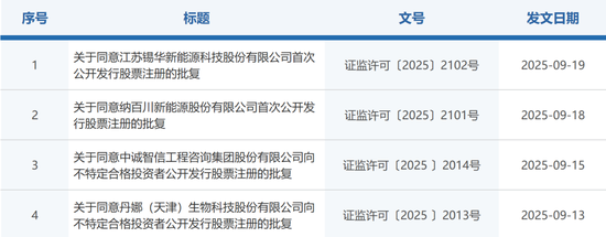9月19日晚,证监会核发了3家IPO企业的发行批文,加上昨天核发的纳百川【IPO批文】创业板纳百川获IPO批文,浙商证券保荐!今年已有70家发行上市,他们花了多少钱?,本周证监会就核发了一共4家IPO企业批文,其中丹娜(天津)生物科技股份有限公司的批文时间显示是在上周,但确实是今日才披露挂网的。其中,批文核发最快的是江苏锡华新能源科技股份有限公司,从过会到现在还没半个月,提交注册仅用12天。